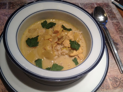 -remove chicken and add garlic, onion, leek, carrots, and ginger. saute for 3 minutes. Add curry powder and cook stirring constantly for 2 more minutes