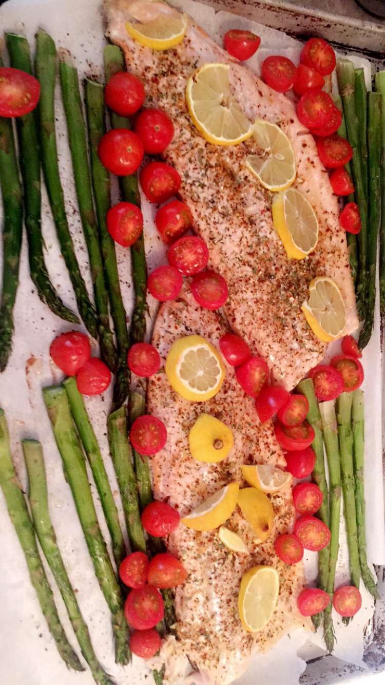 7. Remove the baking sheet from the oven, stir the asparagus and push them to the sides, place the fish in the middle and the tomatoes and around the fish. Top the fish with the lemon slices.